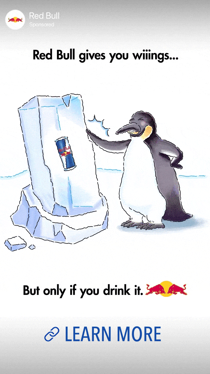 Three looping cinemagraphs bring the “…but only if you drink it” idea to life—turning the line into a visual metaphor: no Red Bull, no wings. Across three icy setups, the penguins try (and fail) to get the can, reinforcing the playful truth behind the message.